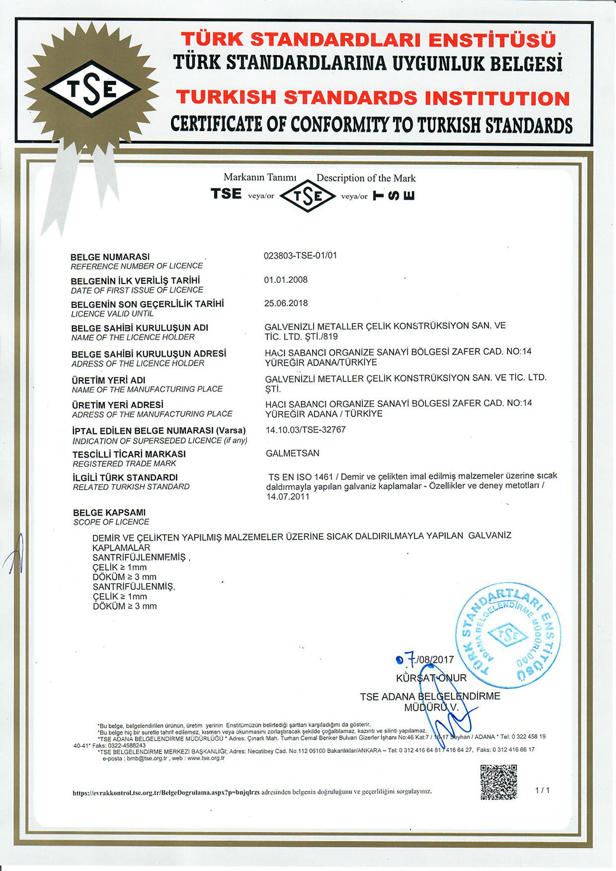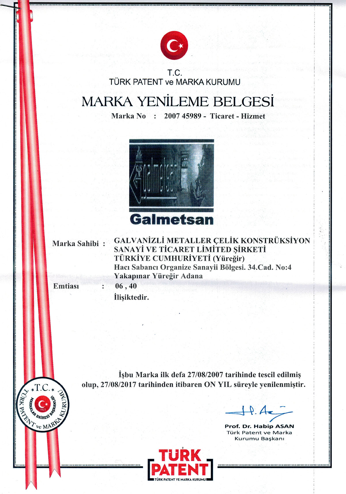 Galmetsan Galvanizli Metaller Çelik Konstrüksiyon San. ve Tic. Ltd. Şti. olarak ulusal ve uluslararası kurumlardan aldığımız kalite ve patent belgeleri.